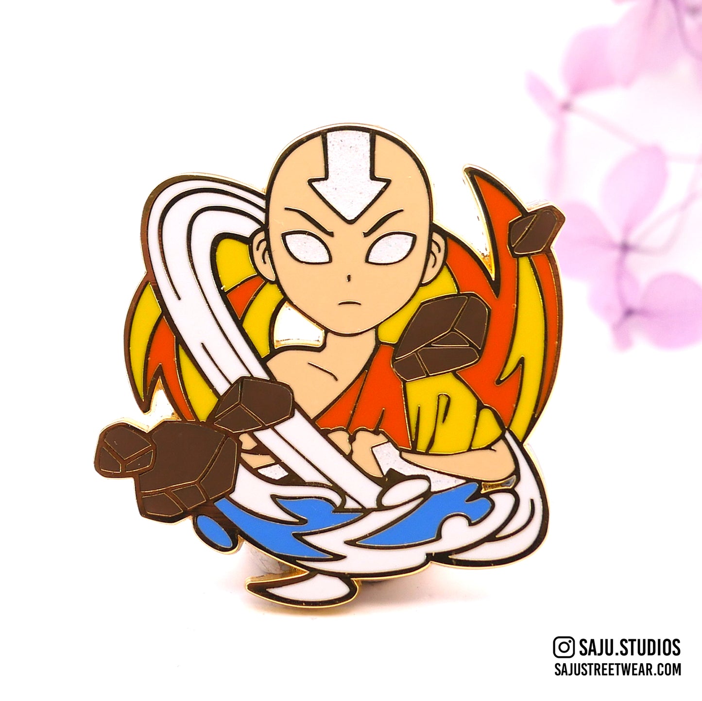 Aang enamel pin from Avatar The Last Airbender. Made from gold metal with glitter and coloured enamel.