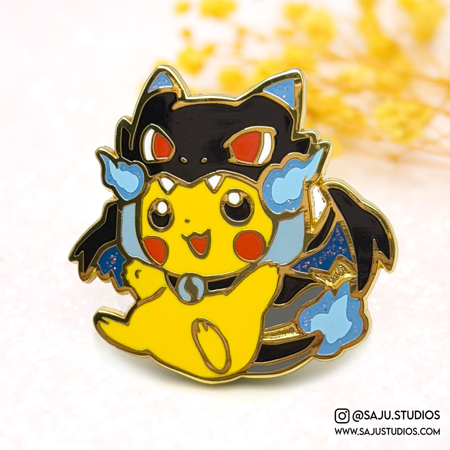 1.6" gold plated enamel pin with glitter and screenprint effect! Comes with two rubber clutches and packaged with a backing card.