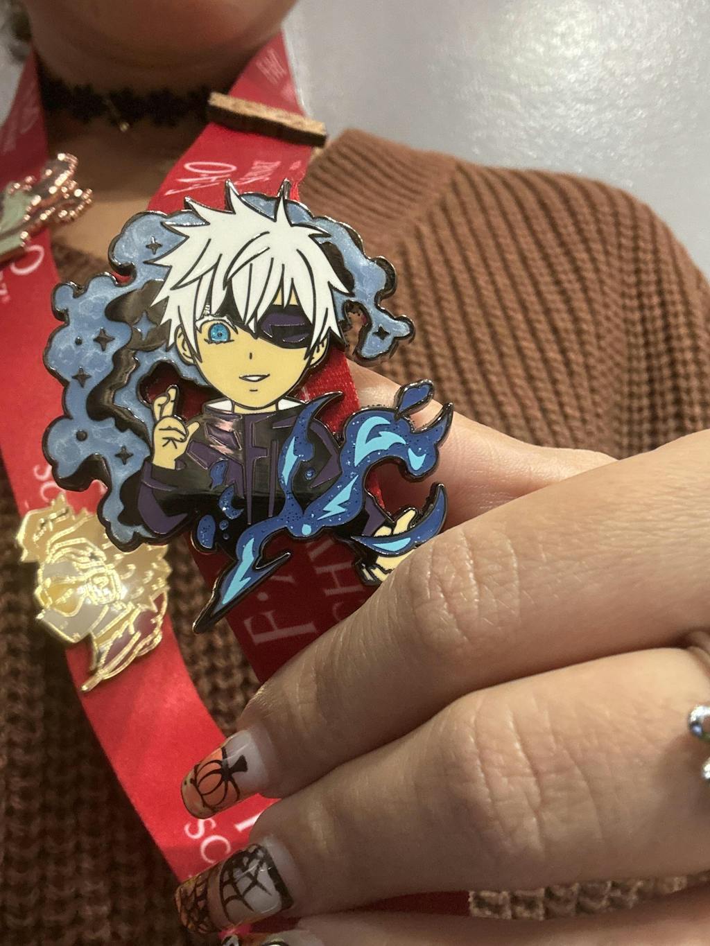 2" tall enamel pin of Sukuna in black nickel - comes with two rubber clutches and a custom designed backing card.
