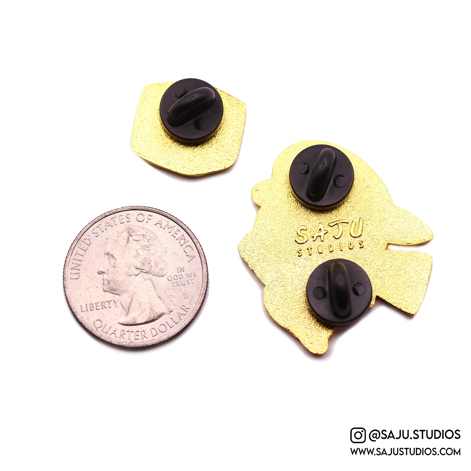 1.4" gold plated enamel pin and 0.6" gold plated enamel pin with glitter. Comes with two rubber clutches on each pin and are packaged together with a backing card.