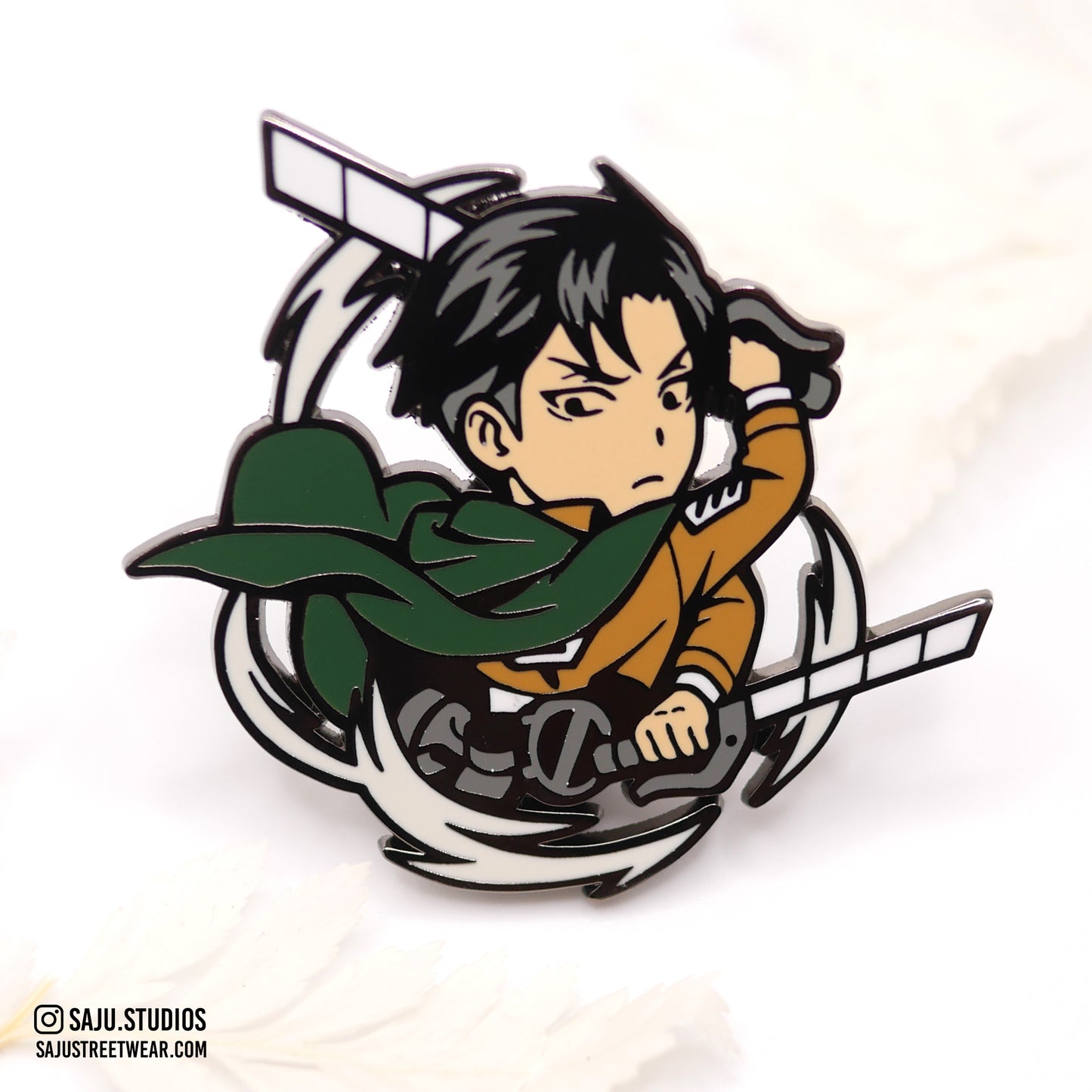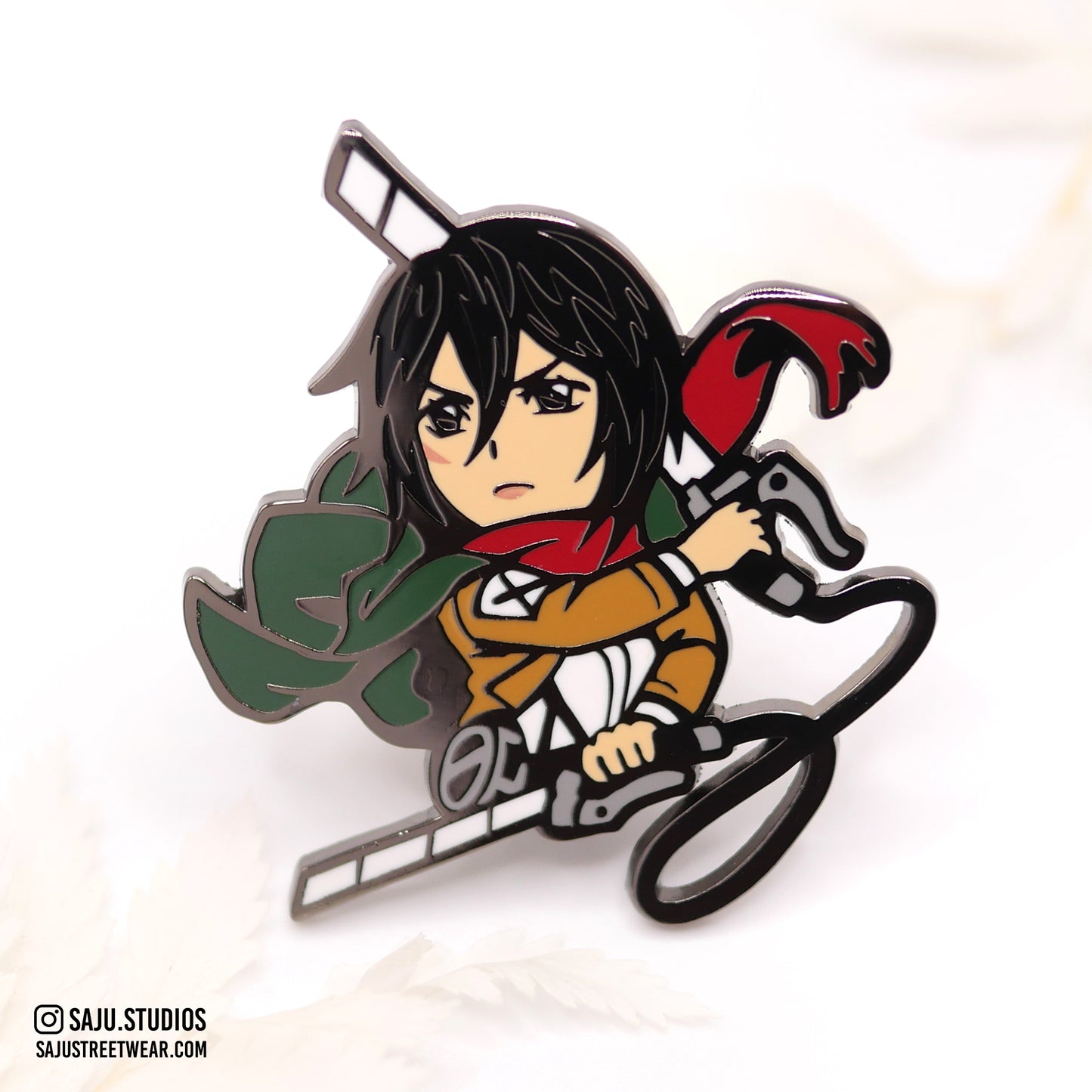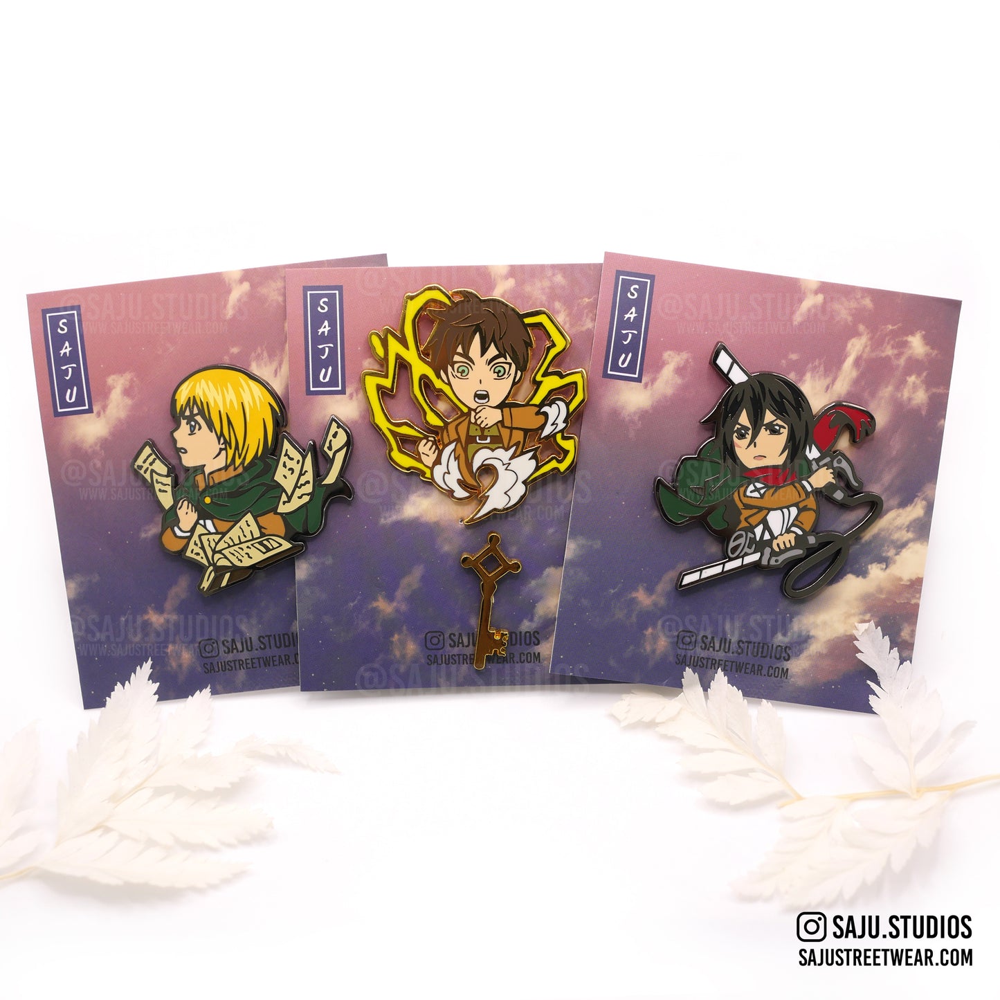 2" black and gold metal enamel pins drawn by SAJU. Each pin comes with two rubber clutches and is packaged individually with a custom designed backing card.