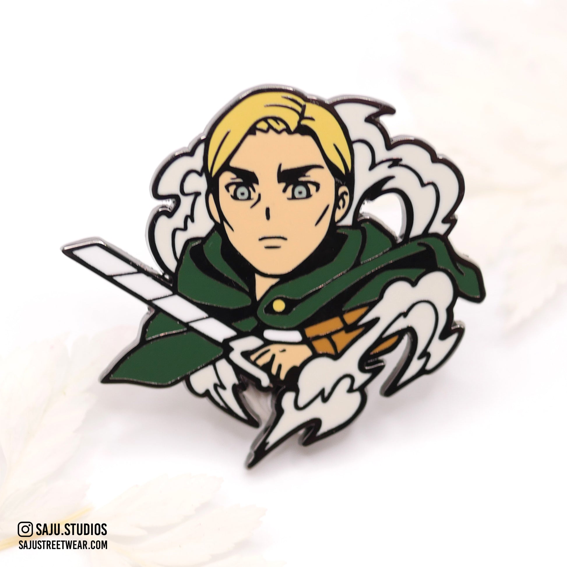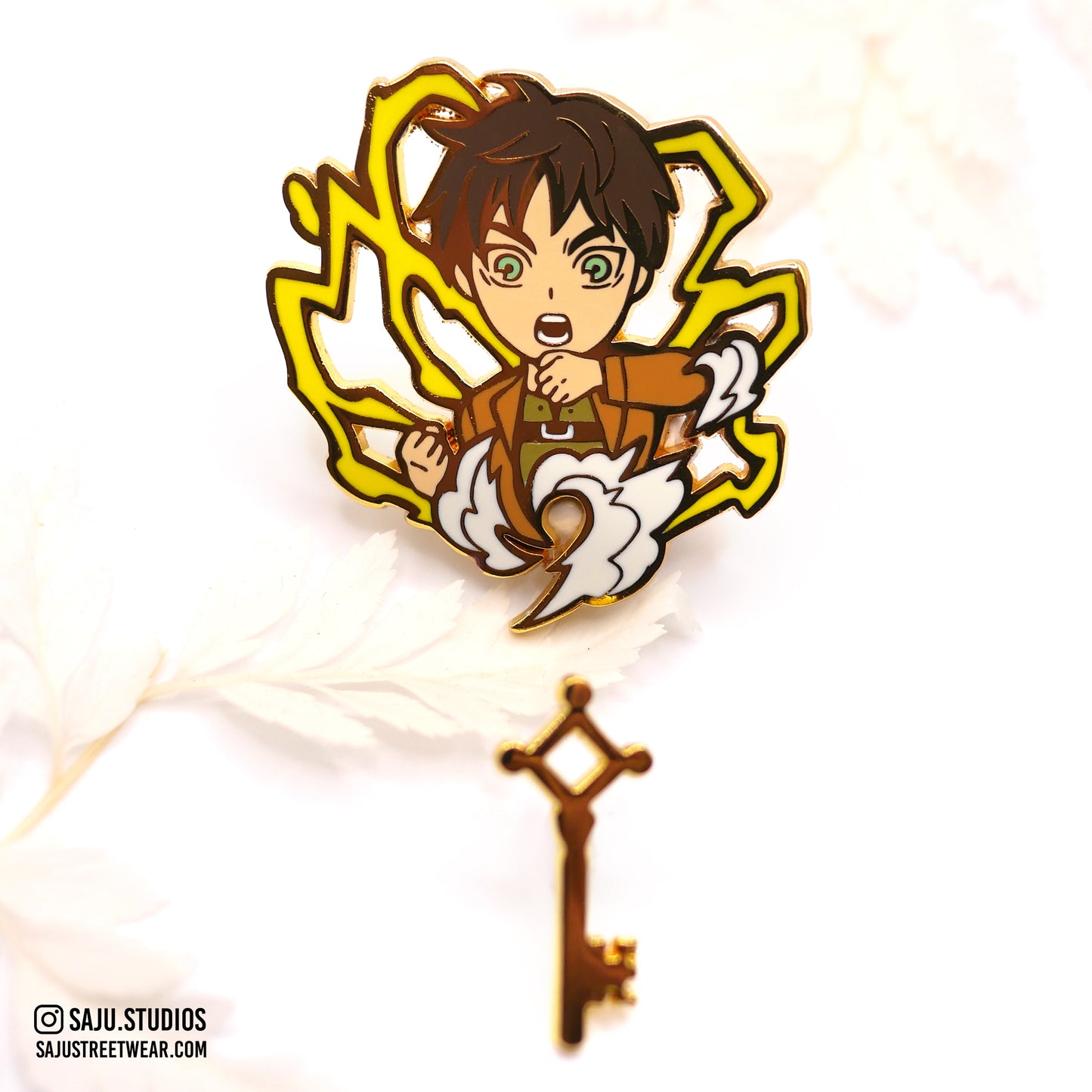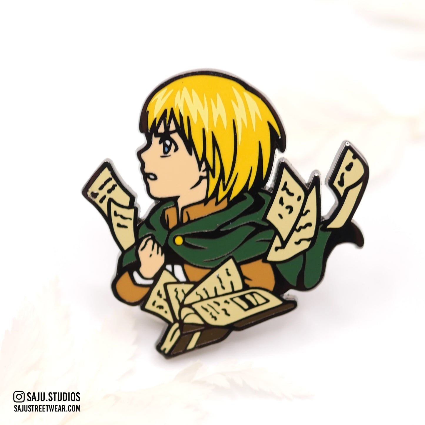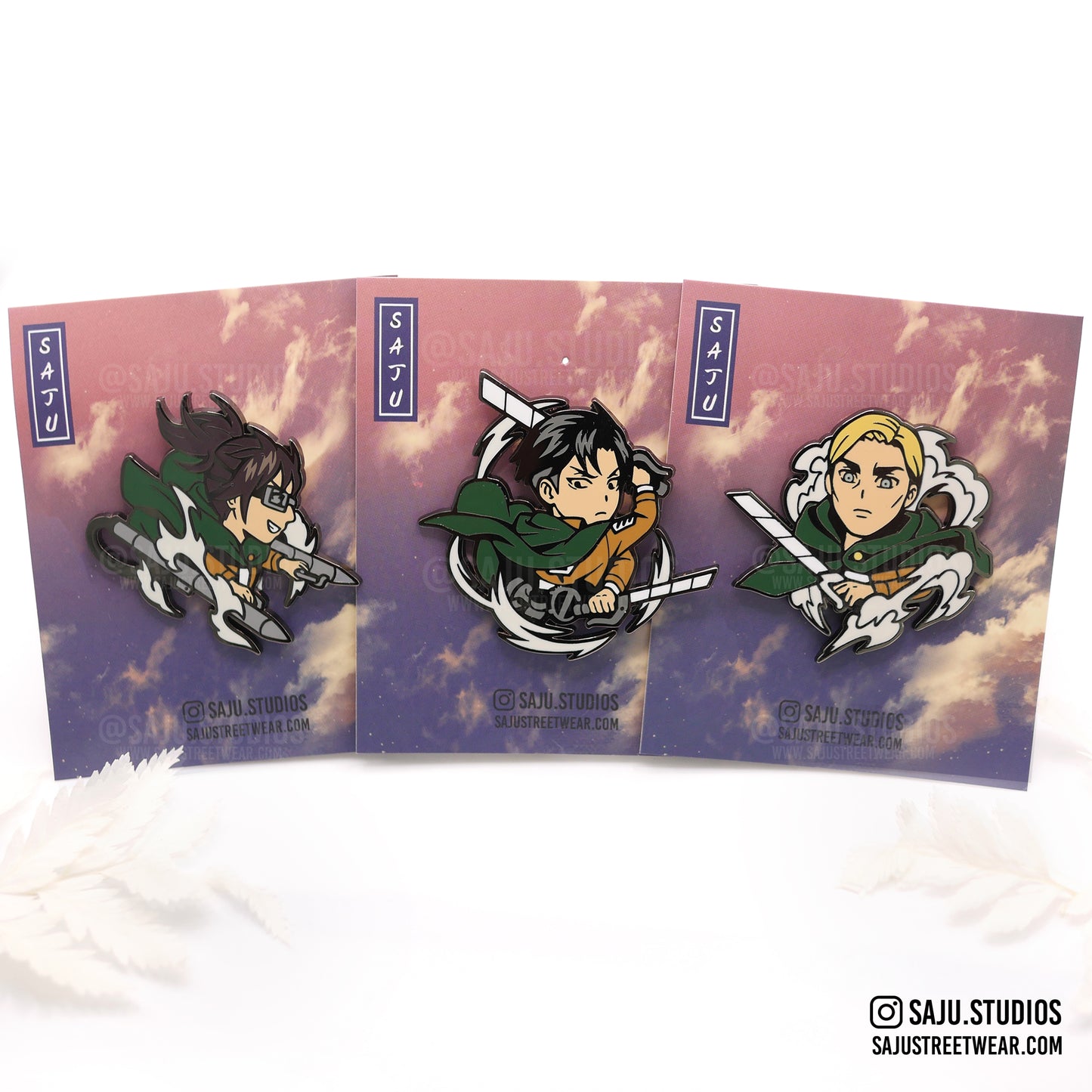 2" black and gold metal enamel pins drawn by SAJU. Each pin comes with two rubber clutches and is packaged individually with a custom designed backing card.